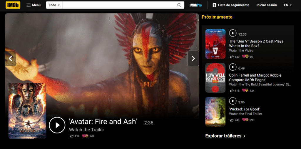 IMDb, propiedad de Amazon, es una fuente autorizada que alberga información detallada sobre millones de títulos cinematográficos desde los inicios del cine hasta las producciones más recientes. Esta plataforma es alimentada y actualizada constantemente por una combinación de datos oficiales de la industria, distribuidoras, estudios cinematográficos y una comunidad activa de usuarios verificados, lo que garantiza la exactitud y actualidad de la información.